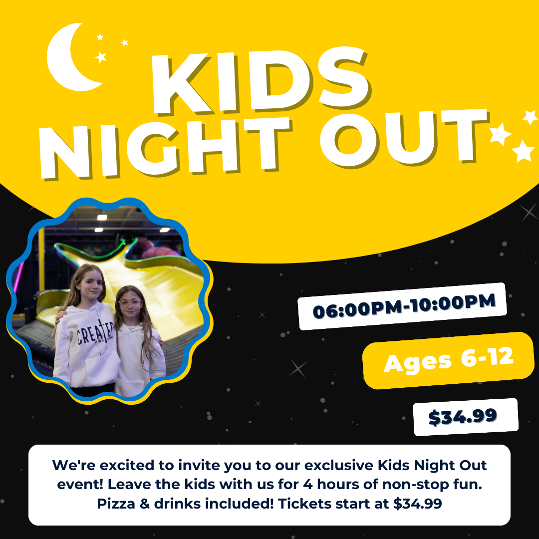 Parents- leave the kids with us for 4 hours of non-stop fun! Tickets include slide time, games, pizza and a drink. Ages 6-12 years old only.